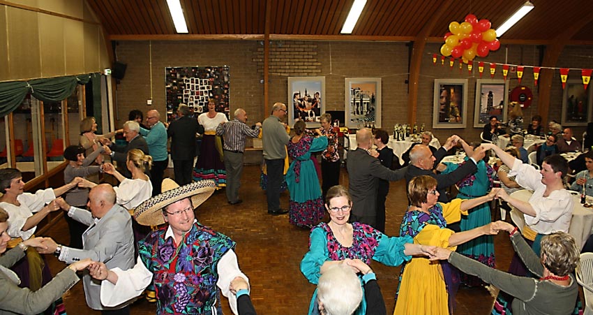 15 jarig jubileum bridgevereniging Alert Culemborg. Zaterdag 13 april jl. vierde bridgevereniging Alert haar 15 jarige bestaan in de tafeltennishal van TTV Gispen, die door de feestcommissie was omgetoverd in een ruime feestzaal in Spaanse sferen. De 112 leden, die zich voor de drive hadden ingeschreven, werden vanaf kwart voor een onthaald met koffie en thee en een tompouce met het logo van de club. Na een welkomstwoord van voorzitter Nico Mocking begon om half twee de feestdrive met 56 paren en eindigde het kaartdeel rond de klok van vijf uur. Alle leden werden uit de speelzaal naar de bar gedirigeerd en de geblindeerde bridgezaal werd, door de feestcommissie en een aantal vrijwilligers, omgebouwd tot een waar restaurant. Binnen een klein uur waren alle tafels voorzien van prachtig tafellinnen en mooi gedekt. Achterin de zaal stond een uitgebreid Spaans buffet, bereid door Bazuijnen Partyservice uit Tiel opgesteld. Bij terugkeer in de zaal verbaasden de leden en introducés zich over de metamorfose, die de bridgezaal had ondergaan. Onder de klanken van live gitaarmuziek, ondersteund door het Spaanse ritme van slagwerk, zochten de leden een tafel op en wachtten op wat er hun te wachten stond. Opvallend was de open ruimte bij de ingang van de zaal, die na later bleek nodig was voor een verrassend ‘tussengerecht’. Na een uitleg in het Spaans van alle uitgestalde gerechten en de eerste tappasronde langs de buffettafels, werd het feest opgeluisterd door dansgroep Oriënt die, zoals gezegd als ‘tussengerecht’ een aantal Mexicaanse dansen op de houten vloer demonstreerde en een aantal brigdeleden zover kreeg om de basisbeginselen van Mexicaanse dansen bij te brengen. Na dit optreden kon er verder gegaan worden met het overvloedige buffet. Het geheel werd afgesloten met een prachtig Grand Dessert, dat door het team van Bazuijnen Partyservice, in Spaans kostuum, werd uitgeserveerd. Als sluitstuk van de avond werden de prijswinnaars van de feestdrive bekend gemaakt; Het slotwoord was wederom voor voorzitter Nico Mocking, die bedankte voor de inzet van de feestcommissie, de groep van Bazuijnen Partyservice, de muziek, de bediening en hij sloot af met: “Het was een geweldig feest, waar we weer vijf jaar op kunnen teren”.