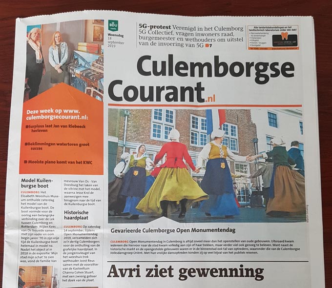 Speciaal voor Culemborg 700 Open Monumentendag 2018 is de choreografie ‘De Blauwe Lappen’ gemaakt. Hierin wordt het verhaal uitgebeeld van de opstand van de vrouwen in 1650. Onze dansleidster Petra van Koelen stelde voor om een nieuwe choreografie te maken over de opstand van de Blauwlappen in 1650. We hebben gekeken of de dans op de muziek van ‘Culemborg dat Klopt!’ van Bas Verberk gemaakt kon worden. En dat is gelukt. Leden van het orkest Vranje hebben een nieuwe tekst gemaakt om het verhaal duidelijk te maken. Het verhaal gaat over de Culemborgse vrouwen die in opstand komen tegen de zoveelste zwaardere belasting op het malen van het graan. Ze trekken in grote groepen richting het stadhuis met hun schorten, hun blauwe lappen, aan lange stokken geknoopt en richten hun woede op de ruiten van het stadhuis. Ook het liefdesverhaal van molenaarszoon Gijssie en Metje komt in de dans tot uiting. ‘De Blauwe Lappen’ blijft in het repertoire en daarmee blijven we, ook na Open Monumentendag, Culemborg op de kaart zetten. |