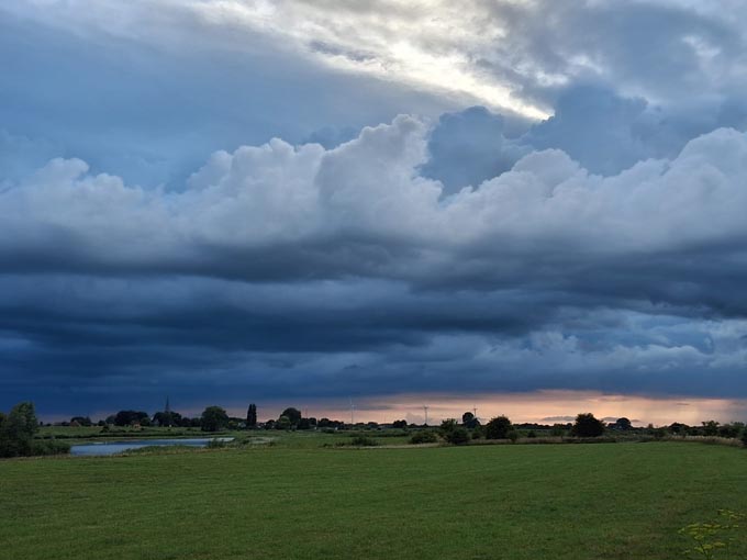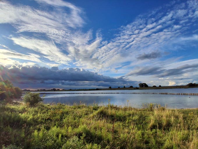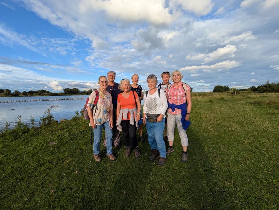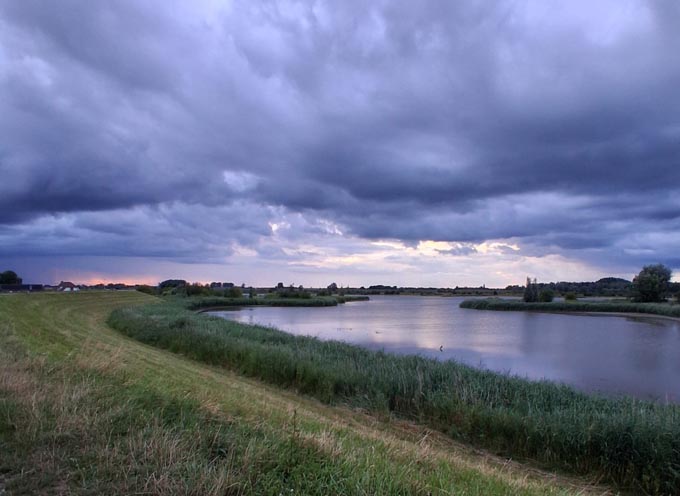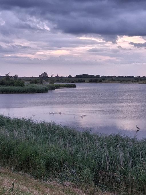 | Verslagje van Riekie: Prachtige dreigende luchten die steeds de goede kant uit gingen en we hebben veel vogels gespot: op de foto zes grote witte lepelaars verder nog puttertjes op distels, kraaien, aalscholvers, kluten, ooievaar met jongen op nest en door Charlotte met de verrekijker: visdiefjes, tureluurs en lepelaars die overvlogen, helaas niet gelukt om ijsvogels te spotten. |