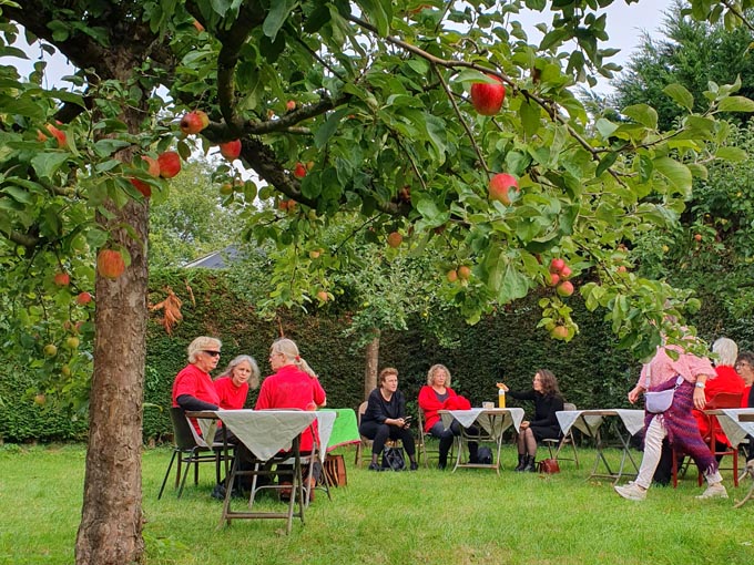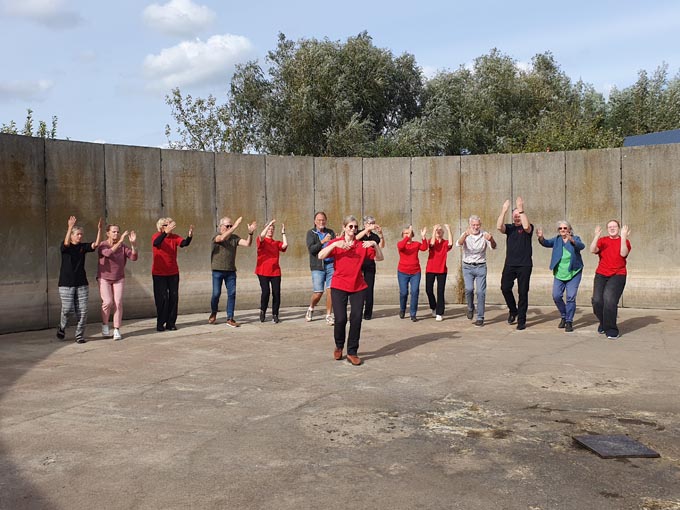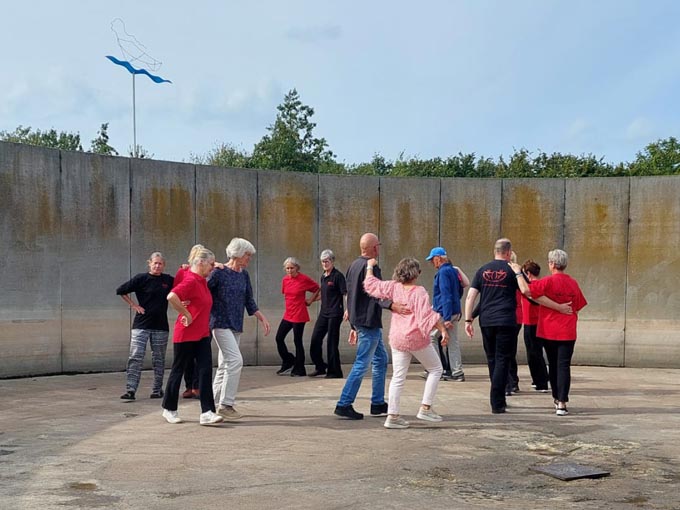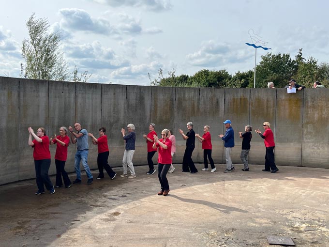 deze middag een workshop Werelddansen. Iedere keer een leuk aantal bezoekers dat een half uurtje met ons mee wil dansen. En verrassend.. ook een ruim aantal mannen doen mee! Heel gezellig en voor ons wel een heel aparte locatie om te dansen, in een enorme (gelukkig gerenoveerde) gierput! Het mooie weer werkte heel erg mee aan de fantastische sfeer deze middag. |
